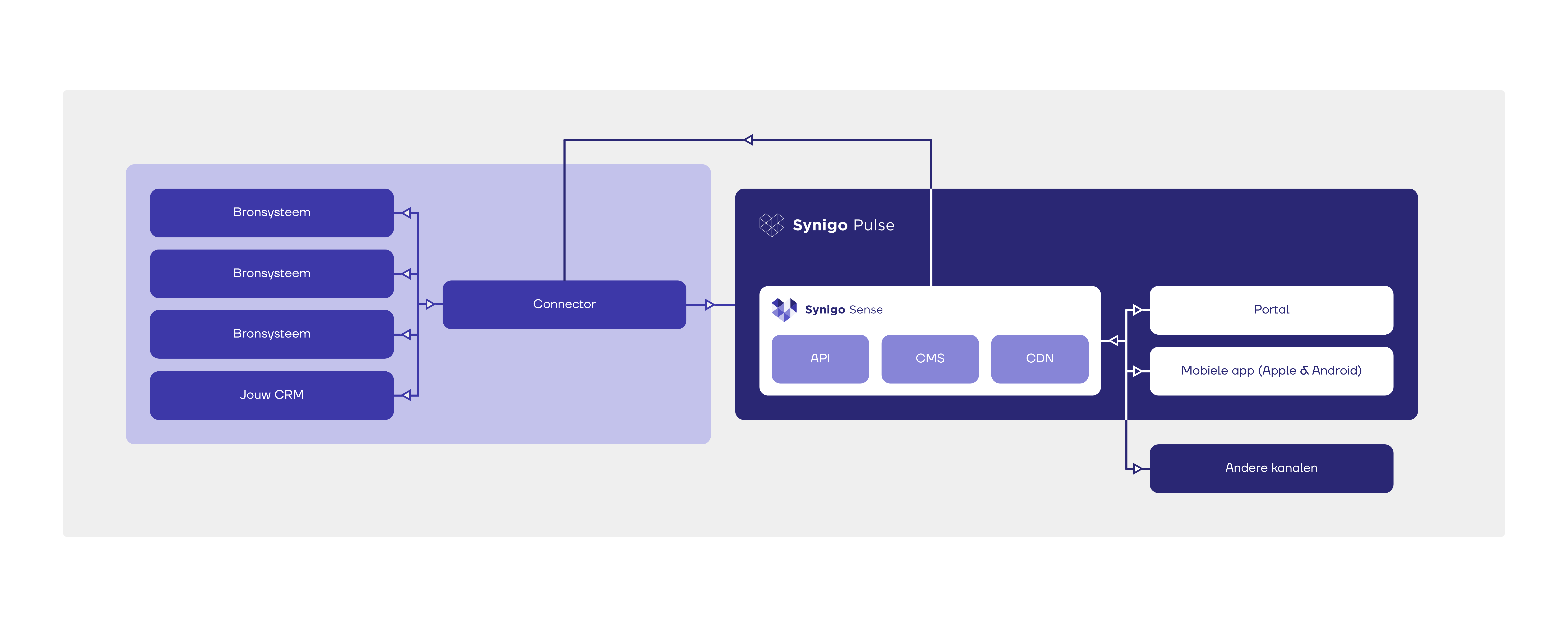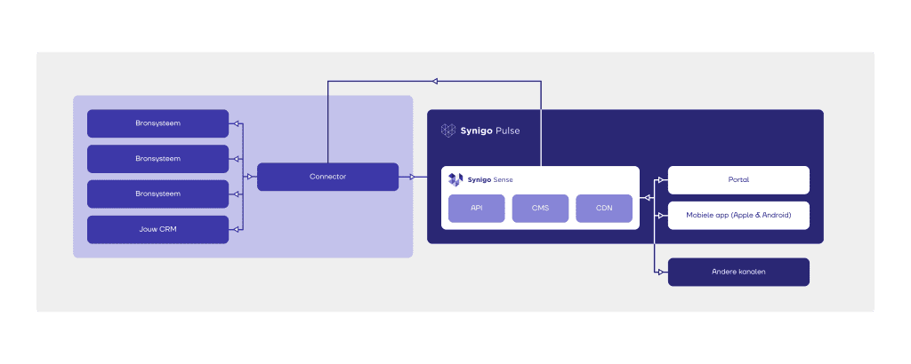 Synigo Sense fungeert als abstractielaag bovenop de bestaande systemen en voorkomt daarmee applicatievervlechting, wat het beheer en het aanpassen van deze (deel)systemen vereenvoudigt.