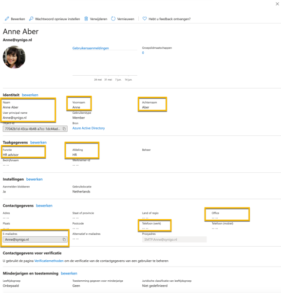 Een screenshot van een Azure AD profiel met de velden aangemerkt, die standaard gesynchroniseerd worden.