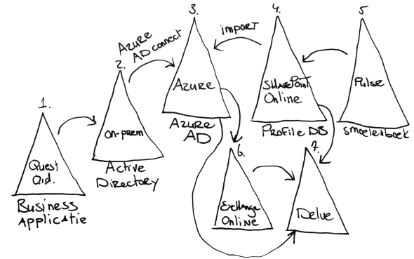 In onderstaand overzicht van de Microsoft omgeving is te zien hoe de keten van profiel-informatie eruit kan zien en uiteindelijk in het smoelenboek terecht kan komen; Microsoft AD, Azure AD, Exchange, SharePoint online, Exchange Online.